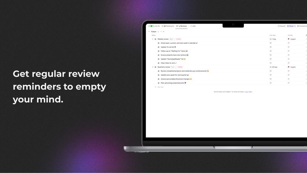Getting started with the GTD system is easy. Simply copy the template to your workspace, and you're ready to capture everything that goes through your mind.